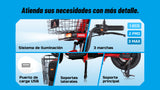 - Sistema de iluminación: Luz trasera, luz de freno, intermitentes delanteros y luces de circulación diurna para mayor visibilidad.